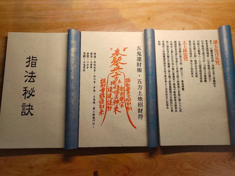 指法秘訣、斬鬼咒、五鬼運財、除邪咒、收鬼咒、收妖咒、太歲符、打外鬼符、接魂符、擲火燒鬼咒、避邪符、安土地符、滅災減罪符、開光神咒、 斬魂斷魄符、茅山斷緣符退神符、收魂符、斬鬼怪符、治邪心符、安宅符、解降符、鬼仙派勾魂攝魄符、引魂符、陰鬼和合符、波諸魔符、鬼王日、驅邪咒、除陰煞符、五營鬥排法、催神咒、請神咒、收邪護身符、招財開路符、旺財開運符、祭捉魂水龍光符等…