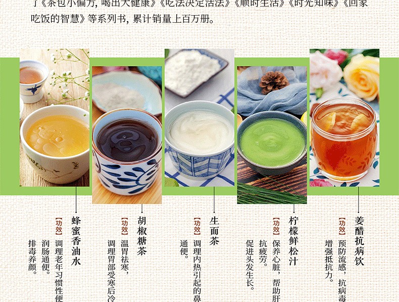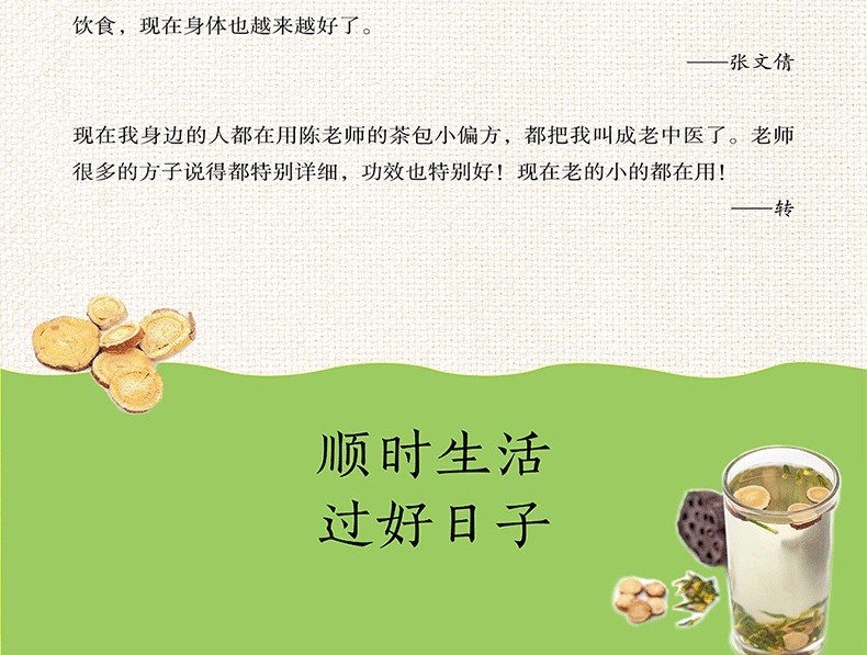 順時強身篇:共有75個保健茶方,根據季節和個人體質不同,專為全家設計的老人、兒童、女性、男性保健茶飲。