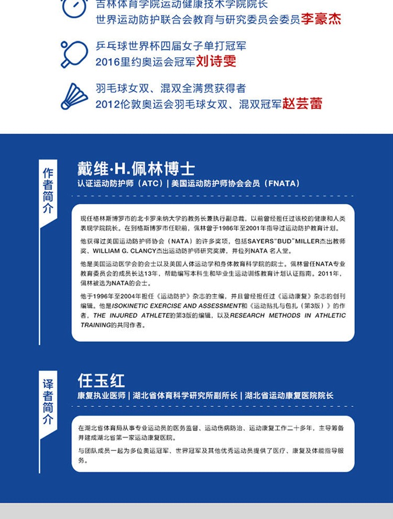 戴維·H.佩林博士,認證運動防護師(ATC),美國運動防護師協會會員(FNATA),現任格林斯博羅市的北卡羅來納大學的教務長兼執行副總裁,以前曾擔任過該校的健康與人類表現學院院長。在格斯博羅市任職前,佩林曾於1986 年zhi2001年指導運動防護教育計畫。他曾獲美國運動防護師協會(NATA)的許多獎項,包括Sayers“Bud”Miller傑出教師獎、zui著ming的運動防護師獎、William G. Clancy傑出運動防護師研究獎牌,併位列NATA 名人堂。他是美國運動醫學會的會士以及美國人體運動學和身體教育科學院的院士。佩林曾擔任NATA專業教育委員會的成員長達13年,協助撰寫本科生和畢業生運動訓練教育計畫認證指南。 2011 年,佩林被選為NATA 的會士。他於1996 年zhi2004 年擔任《運動防護》雜誌的主編,並曾擔任《運動康復》雜誌的創刊編輯。他是Isokinetic Exercise and Assessment和《運動貼紮與包紮(第3版)》的作者,The Injured Athlete的第3 版的編輯,以及Research Methods in Athletic Training的共同作者。